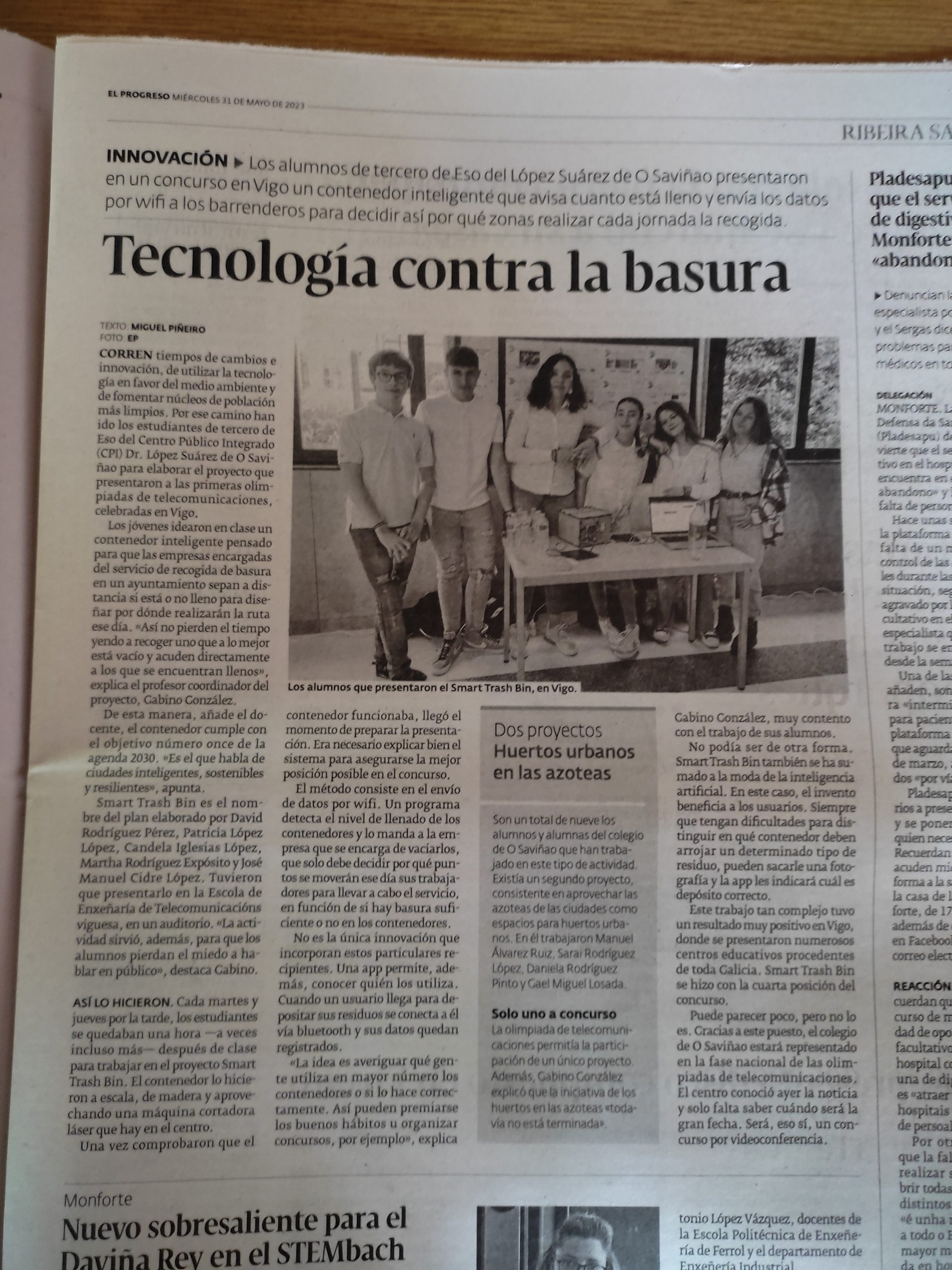 - IES Rosais 2 (Vigo). SEGURVIGAL. Estudiantes (1º Bach): Iago Álvarez García, Senén Bernárdez Rodríguez, Nicolás Fariñas Táboas, Sofía Román Álvarez, Pablo Sabuz Pérez, Daniel Sanmartín Alonso. Docente: Óscar Loeda Rivas.