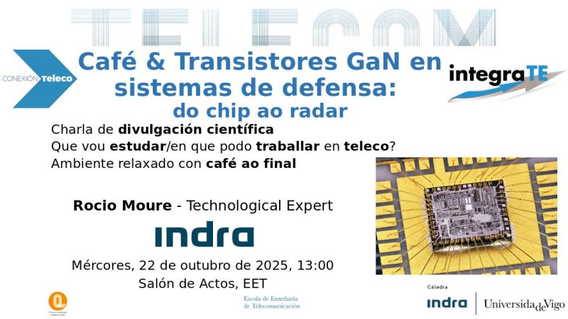 Dentro do programa integraTE, patrocinado pola Cátedra Indra, o vindeiro mércores 22 de outubro ás 13:00, teremos no Salón de Actos a segunda charla do ciclo “Café & …” desta vez centrada nos usos dos transistores GaN. Esta charla está deseñada para estudantes con curiosidade por saber como funcionan os sistemas que permiten traballar tecnoloxías como o radar ou a guerra electrónica. Proporcionarase unha introdución ao papel dos transistores GAN (nitruro de galio) no deseño de sistemas avanzados de RF. Veremos como se desenvolven estes dispositivos, como se integran nos amplificadores de potencia e como se aplican en sistemas reais desenvolvidos por Indra Vigo. Ademais, discutirase o impacto da futura fábrica de chip en Vigo e como pode transformar o ecosistema tecnolóxico galego e as oportunidades profesionais do sector. Esta charla correrá a cargo de Rocio Moure,technological expert, de Indra.